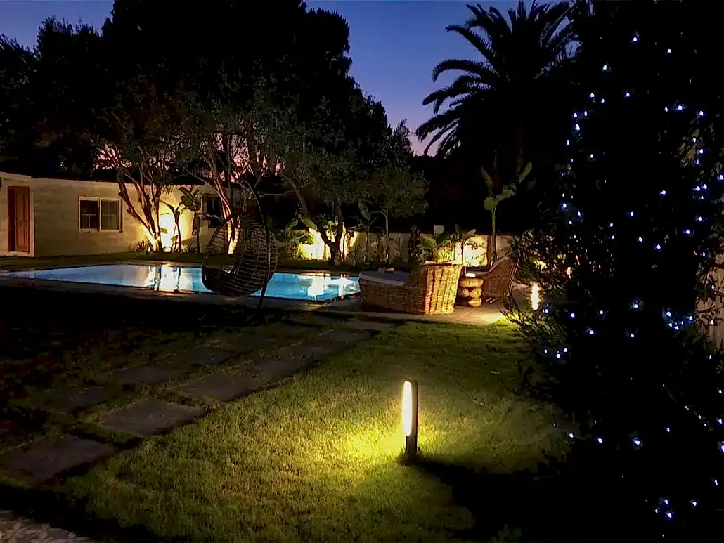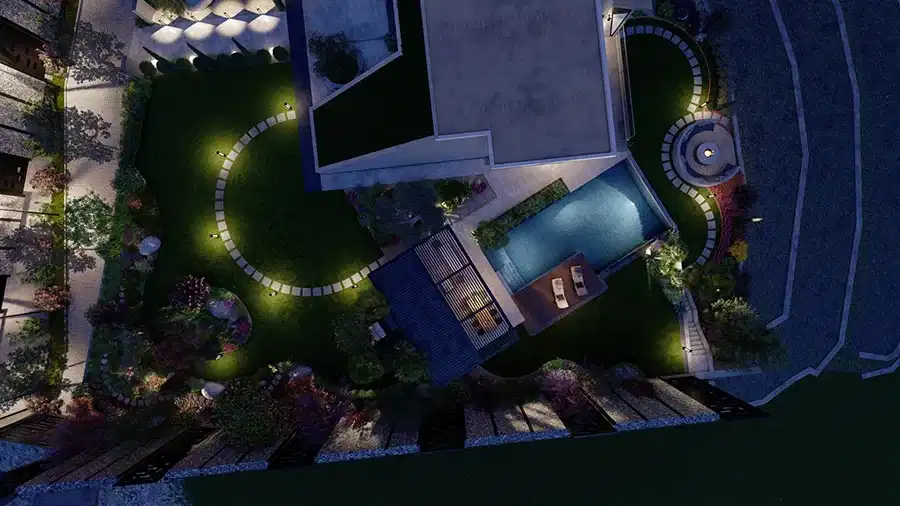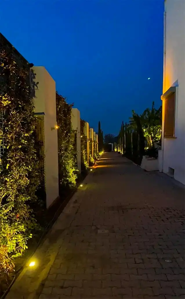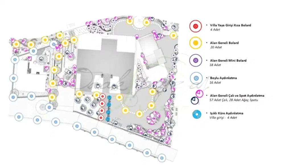 - Planlama ve Zonlama: Armatür yerleri, kablo hatları ve transformatör (voltaj düşürücü) konumları teknik plana işlenir. Farklı amaçlara hizmet eden ışıklar (örneğin sıralı bahçe aydınlatma ile vurgu ışıkları) farklı zonlara ayrılarak, otomasyon sistemine (zamanlayıcı veya akıllı sensörler) bağlanır.