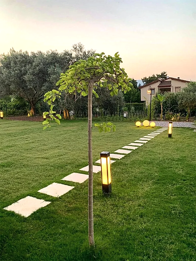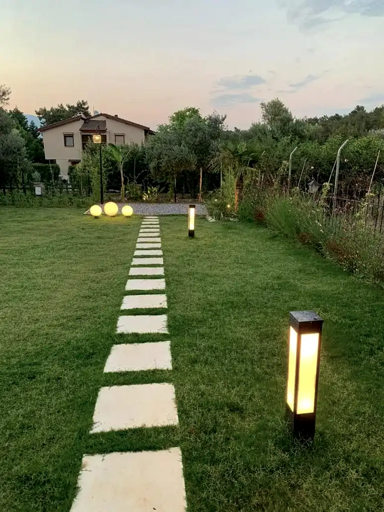 - Bollard (Kısa Direk) Aydınlatmalar: Genellikle bahçe yürüyüş yolu aydınlatma veya sıralı bahçe aydınlatma amacıyla kullanılır. Göz hizasının altında kalarak (kamaşmayı önleyerek) güvenli geçiş sağlar ve mekanın sınırlarını belirler.